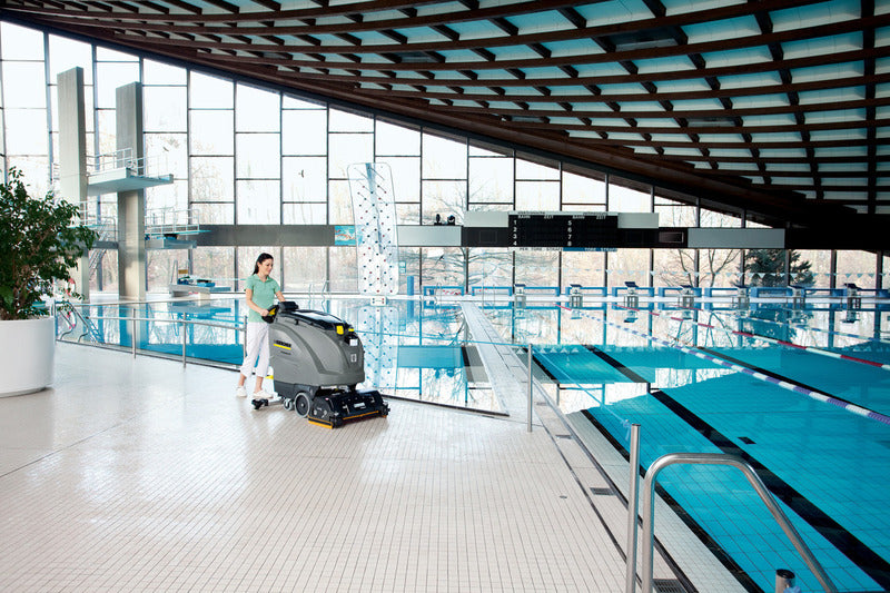 Nachläufer-Scheuersaugmaschine (60 l) für Flächen von 1000 - 2500 m². Mit Fahrantrieb, KIK-System, Tankspülsystem, Auto-Fill, Reinigungsmitteldosierung und Batterie (170 Ah).