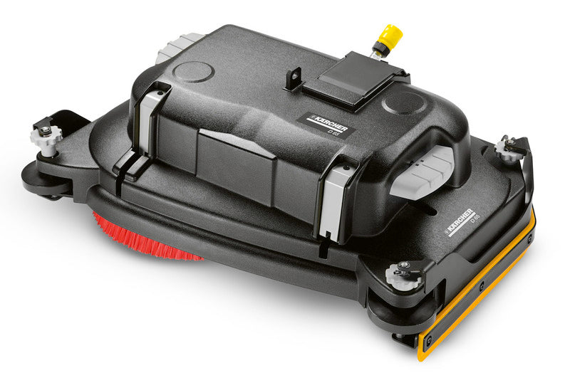 Der Bürstenkopf D 90 S mit zwei Scheibenbürsten verfügt über eine Arbeitsbreite von 90 cm und ist mit einem praktischen Bürstenschnellwechselsystem ausgestattet. Die Seitenschürzen sind höhenverstellbar und halten das Wasser unter dem Bürstenkopf. So wird die Reinigungsflotte dem Saugbalken selbst in Kurvenfahrten optimal zugeleitet. Der Bürstenkopf ist separat verpackt.